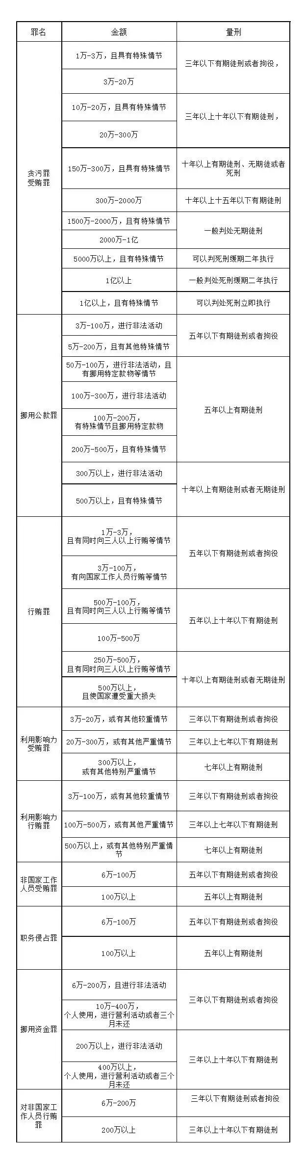 温州最新贪污贿赂犯罪的量刑标准表格版